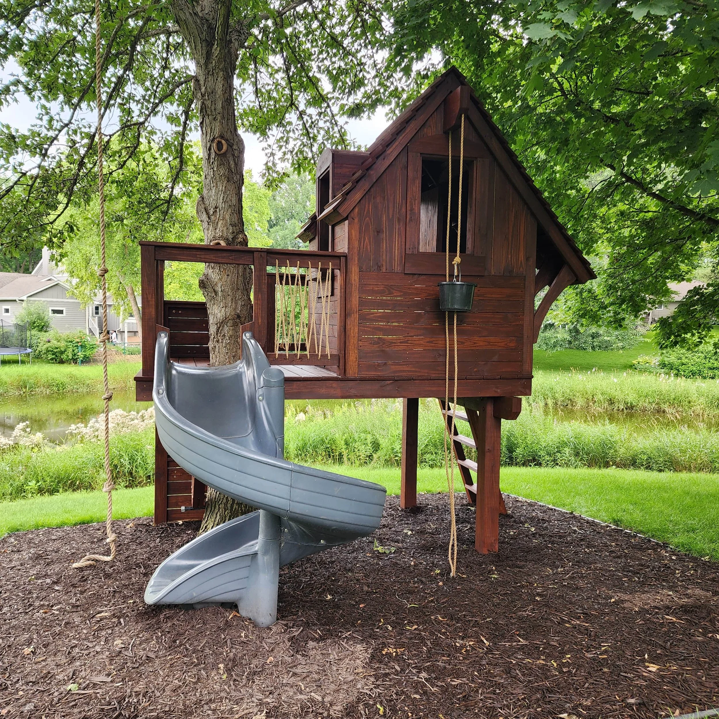 An enchanting world full of wonder and excitement is ready to be discovered with our Storybook Overlook tree fort. Immerse yourself in the magic of delightful childhood adventures as you explore our whimsical tree fort, nestled among the sturdy branches of a grand oak tree. Our truly one-of-a-kind treehouse is complete with engaging features like a climbing rope, an exciting rock wall, a bucket elevator, a thrilling spiral slide, a service window, and a delightful Dutch door, all promising endless fun and entertainment for kids and adults alike. So, climb aboard, play freely, and let your imagination soar in this fantastical hideaway.